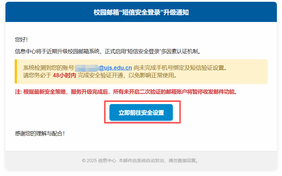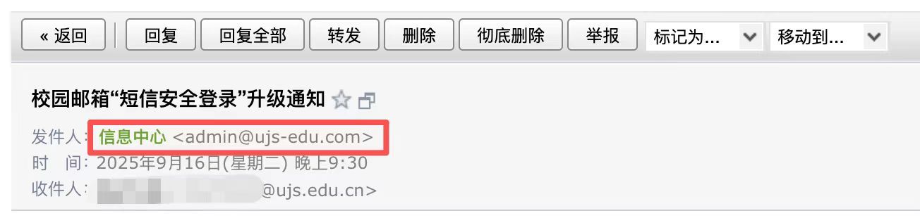 2. 核实发件人地址:收到可疑邮件时,务必核对发件人邮箱地址。学校正式邮箱域名为 @ujs.edu.cn,请勿轻易点击非学校域名的链接。